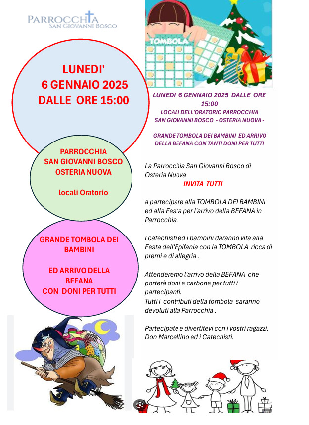 Come ogni anno la Parrocchia San Giovanni Bosco di Osteria Nuova organizza per il pomeriggio di LUNEDI’ 6 GENNAIO 2025 DALLE ORE 15:00 nelle sale dell’oratorio la GRANDE TOMBOLA DEI BAMBINI CON L’ARRIVO DELLA BEFANA